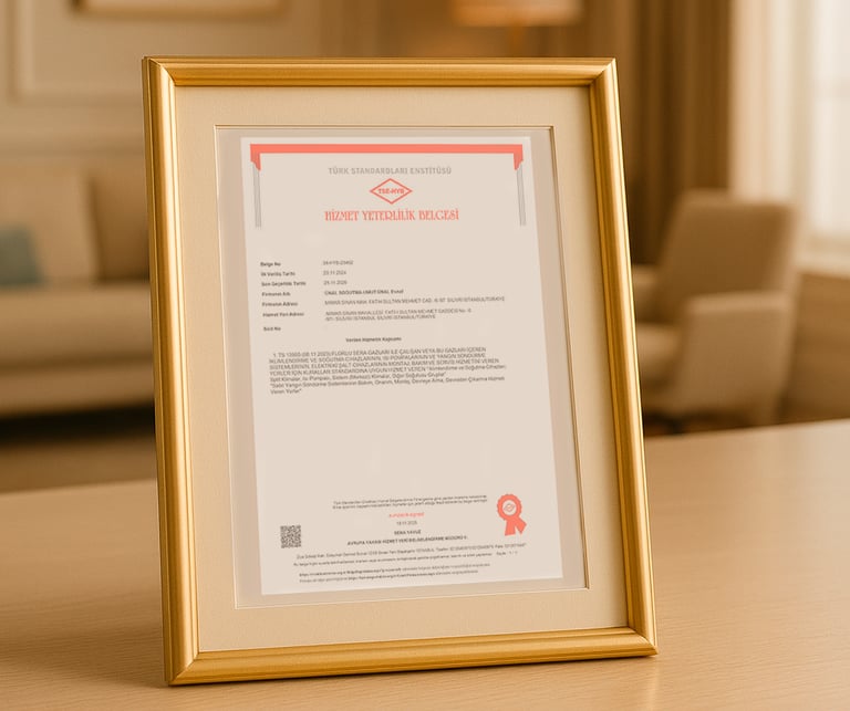 Şirketimiz, TS 13905 florlu sera gazları ile çalışan veya bu gazları içeren iklimlendirme ve soğutma cihazlarının, ısı pompalarının ve yangın söndürme sistemlerinin, elektrikî şalt cihazlarının montaj, bakım ve servis hizmetini veren yerler için kurallar standardına uygun hizmet veren “iklimlendirme ve soğutma cihazları: split klimalar, ısı pompası, sistem (merkezi) klimalar, diğer soğutucu gruplar” "sabit yangın söndürme sistemlerinin bakım, onarım, montaj, devreye alma, devreden çıkarma hizmeti veren yerler belgesine sahiptir.