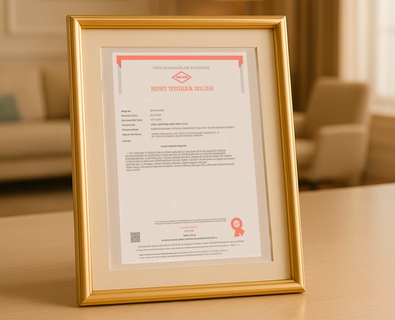 Şirketimiz, TS 13905 florlu sera gazları ile çalışan veya bu gazları içeren iklimlendirme ve soğutma cihazlarının, ısı pompalarının ve yangın söndürme sistemlerinin, elektrikî şalt cihazlarının montaj, bakım ve servis hizmetini veren yerler için kurallar standardına uygun hizmet veren “iklimlendirme ve soğutma cihazları: split klimalar, ısı pompası, sistem (merkezi) klimalar, diğer soğutucu gruplar” "sabit yangın söndürme sistemlerinin bakım, onarım, montaj, devreye alma, devreden çıkarma hizmeti veren yerler belgesine sahiptir.